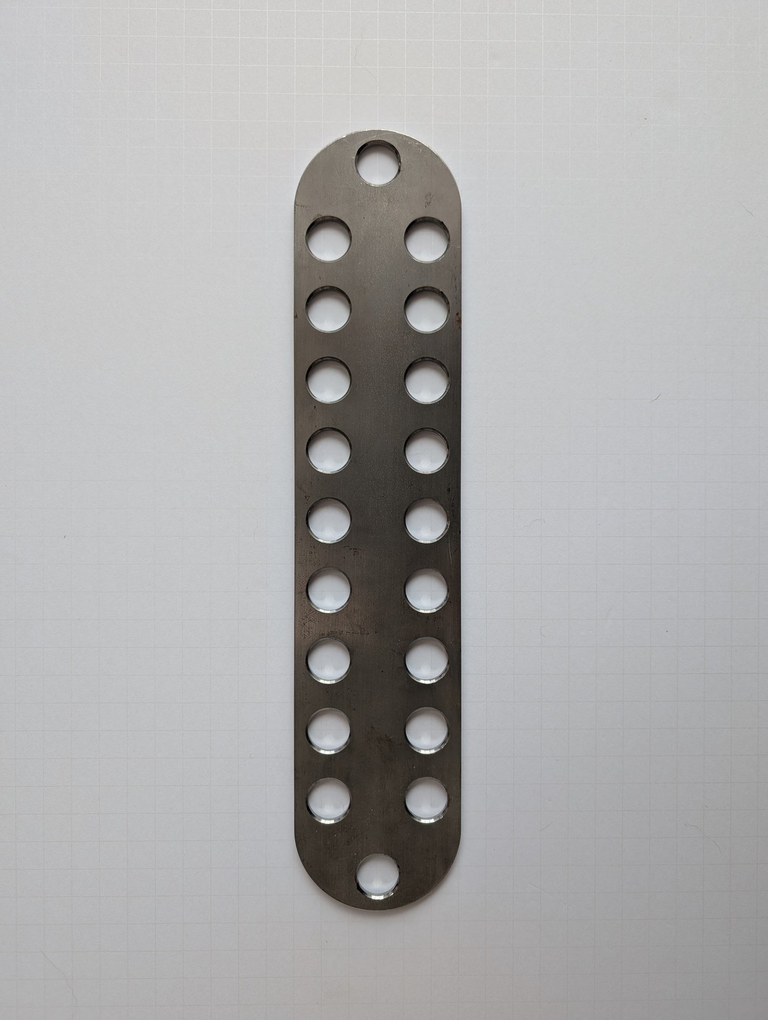 I worked with a steel maker to refine the design. I adjusted the length to 14 inches, slimmed the width to 3 inches, and added 20 holes. This version was much lighter, easier to handle, and drastically improved range of motion. This was the moment I knew I had something real. However, with so many holes, the design felt excessive, leading to the next evolution.